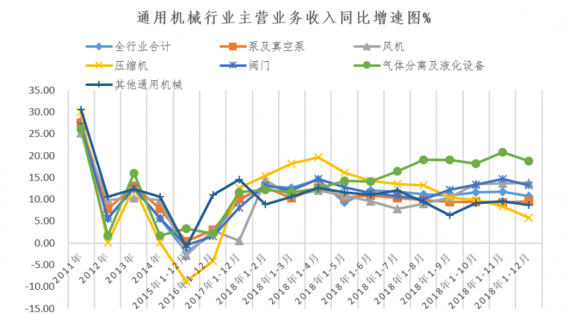 6.总量指标大幅下降,这种下降对行业的发展是有一定利好的。2018年12月底通用机械主营业务收入7987.73亿元,比2017年当年12月底主营业务收入减少1706.91亿元,其中:泵减少397亿,风机减少163亿元,压缩机减少205亿,阀门减少489亿,气体分离及液化减少78亿元,其他通用机械减少373亿元。